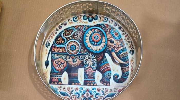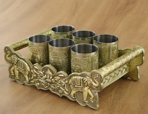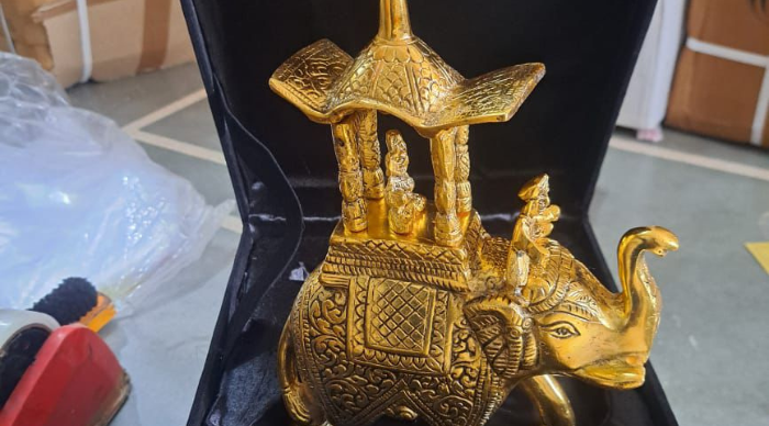 The golden elephant handicraft is a stunning symbol of royalty, strength, and prosperity. Beautifully crafted with intricate detailing, this decorative piece reflects fine traditional artistry and skilled workmanship. The rich gold finish enhances its majestic presence, making it a perfect addition to living rooms, offices, or spiritual spaces. Every curve and pattern is thoughtfully designed to showcase cultural elegance and timeless charm.